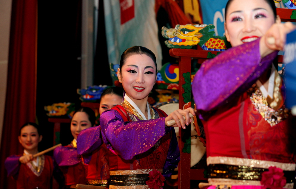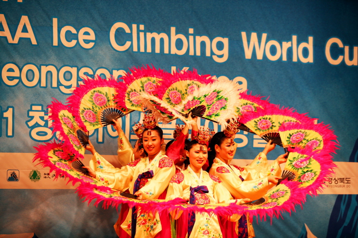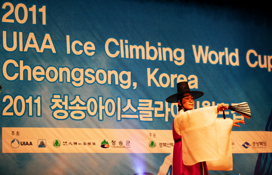 청송 아이스클라이밍 월드컵 개회식을 축하하기 위한 전통 공연팀이 공연을 펼치고 있다.